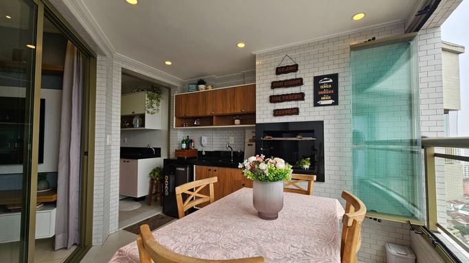 Sala Integrada com Sacada Gourmet: Aproveite a churrasqueira a carvão e desfrute de uma área de convivência com ares de sofisticação e vistas privilegiadas.